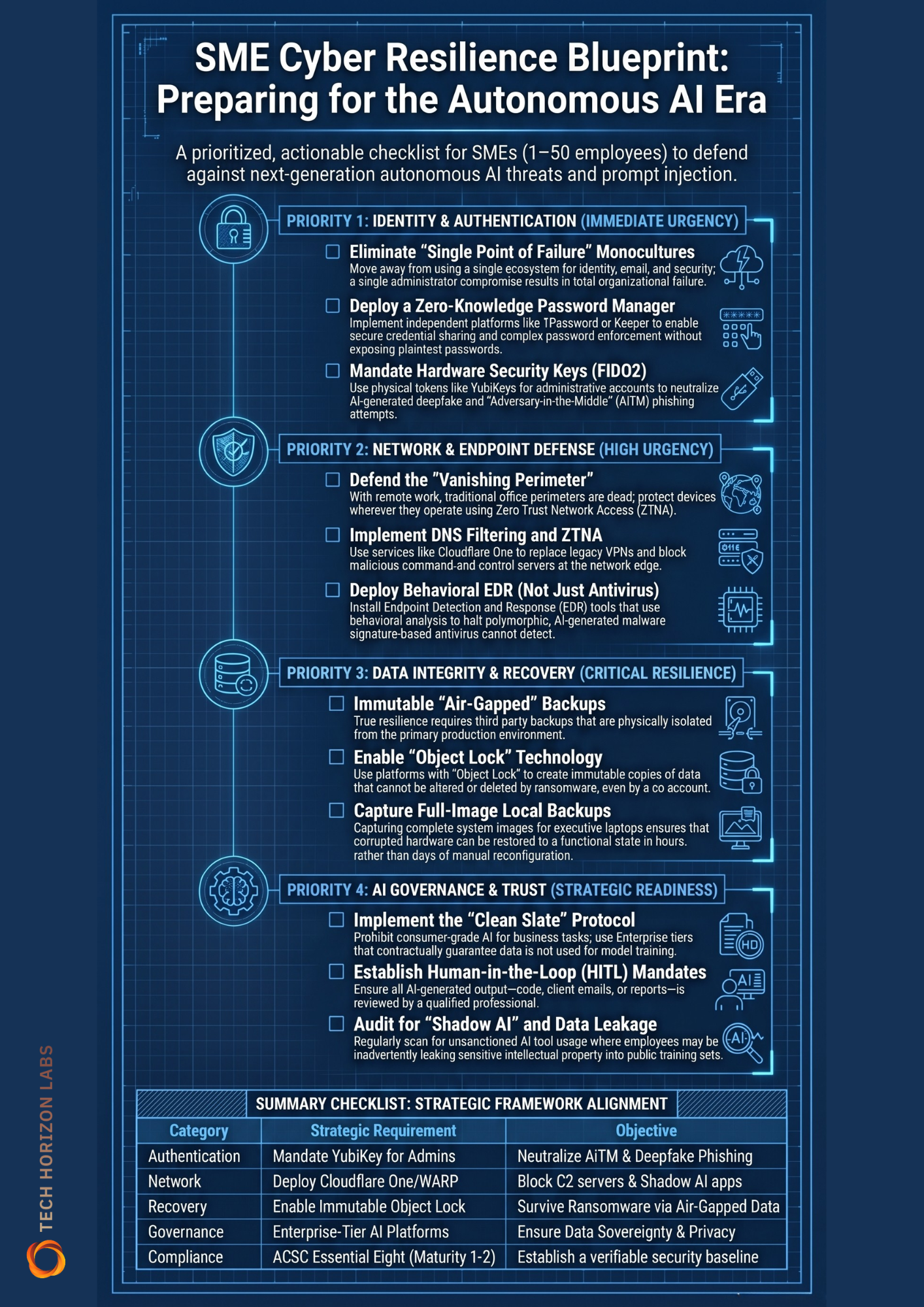 A prioritised, actionable checklist for SMEs (1-50 employees) to defend against next-generation autonomous AI threats. Covers identity, network, data recovery, and AI governance.